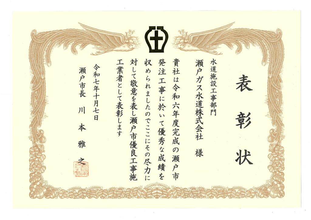 令和7年10月7日に令和7年度 瀬戸市優良工事施工業者表彰式が行われ、水道施設工事部門で表彰を受けることができました。工事関係者の皆様のご協力に御礼申し上げます。